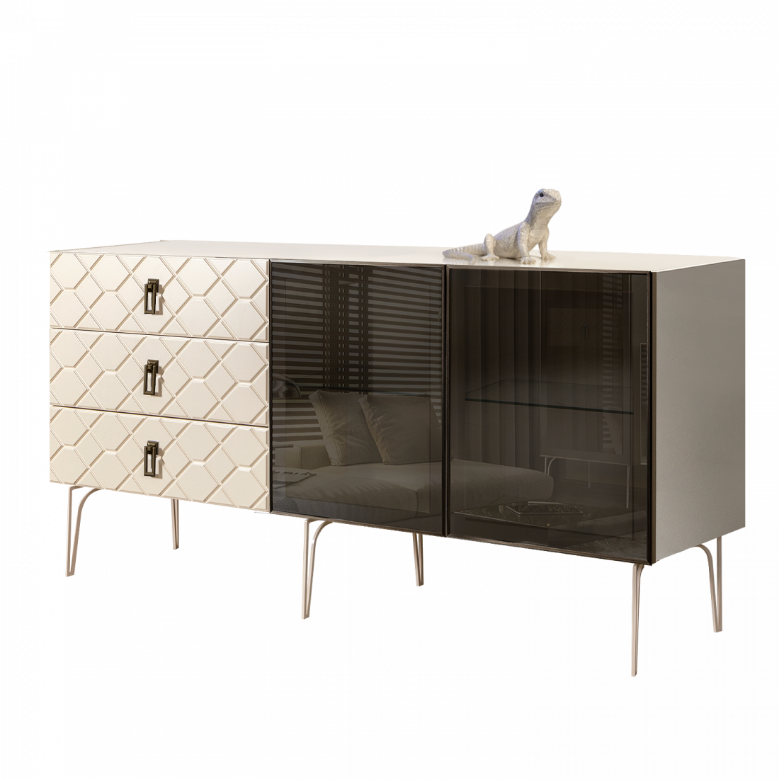 Стекло Stopsol меняет свои отражающие свойства под воздействием источников света. Поверхность, отражающая свет, мягко скроет содержимое вашего комода или витрины.
