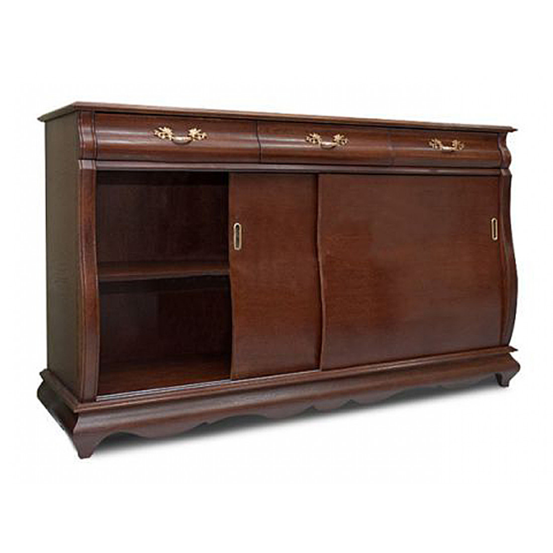 Комод для гостиной из коллекции мебели "Оскар" это классическая и многофункциональная модель. Оснащен двумя раздвижными дверцами и тремя выдвижными ящиками с ажурной фурнитурой. Слегка изогнутые бока фасада и резной рельеф каркаса придают силуэту модели изящность и оригинальность. Комод выполнен с использованием массива и шпона дуба и окрашен в оттенок "Орех".