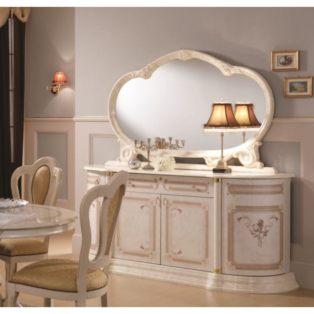Комод для посуды Роза (беж) от фабрики ДИА мебель выполнен в классическом стиле. Бежевый цвет в сочетании с глянцевым покрытием придаст вашей гостиной элегантность и эстетичность. Такой комод поможет Вам сэкономить место и удивит своей многофункциональностью. Большое зеркало в объемной рамке будет визуально осветлять комнату и послужит прекрасным дополнением в интерьере.