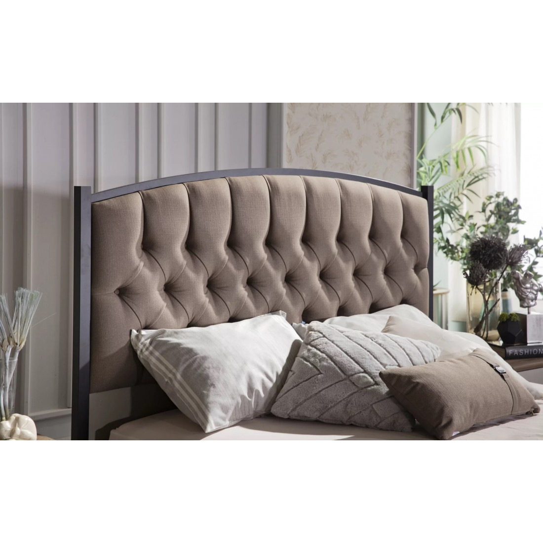 Кровать "Палвин" выполнена в светлых тонах коллекции. Светлое основание с металлическими ножками и мягкой центральной частью на спинке освежат вашу спальню на 100%.