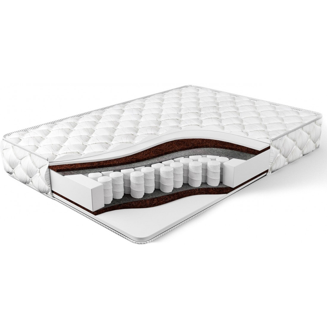 Наполнение: независимый блок TFK, высота блока 140 мм, ортопена 20 мм с двух сторон, кокосовая плита 10 мм с двух сторон, терморегулирующий слой с 2-х сторон, усиление по периметру - короб ортопены.